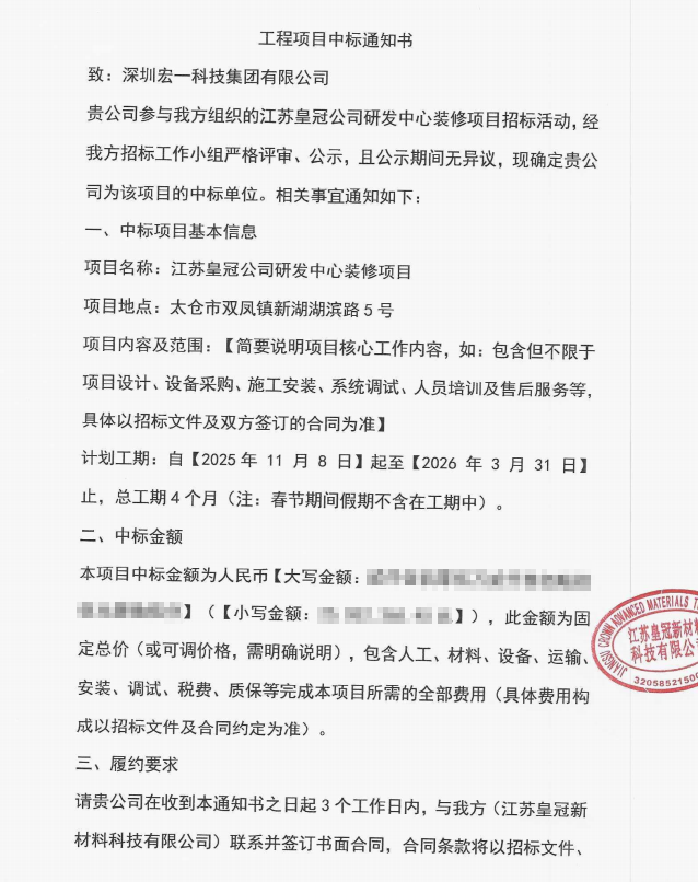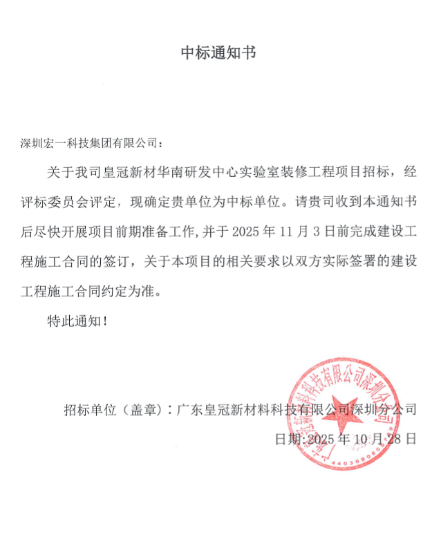 在新质料领域,,,,,新金宝科技实现 “双箭连发”!先后中标皇冠新材华南研发中心实验室装修工程项目和江苏皇冠公司研发中心装修项目。。。。。